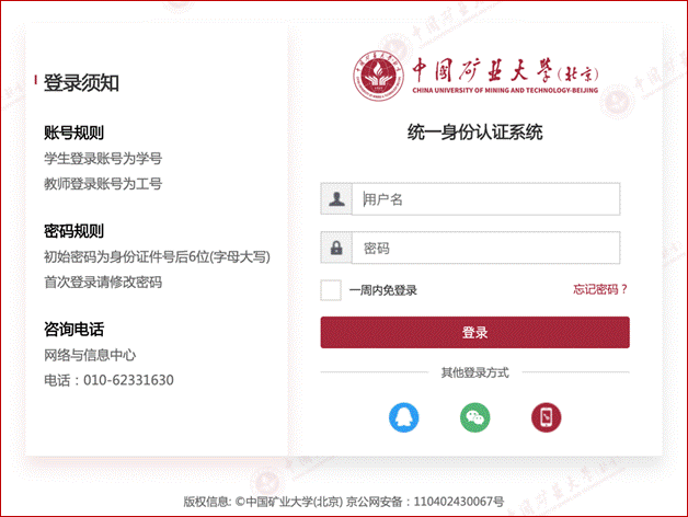 访问http://auth.cumtb.edu.cn/authserver可进入统一身份认证系统