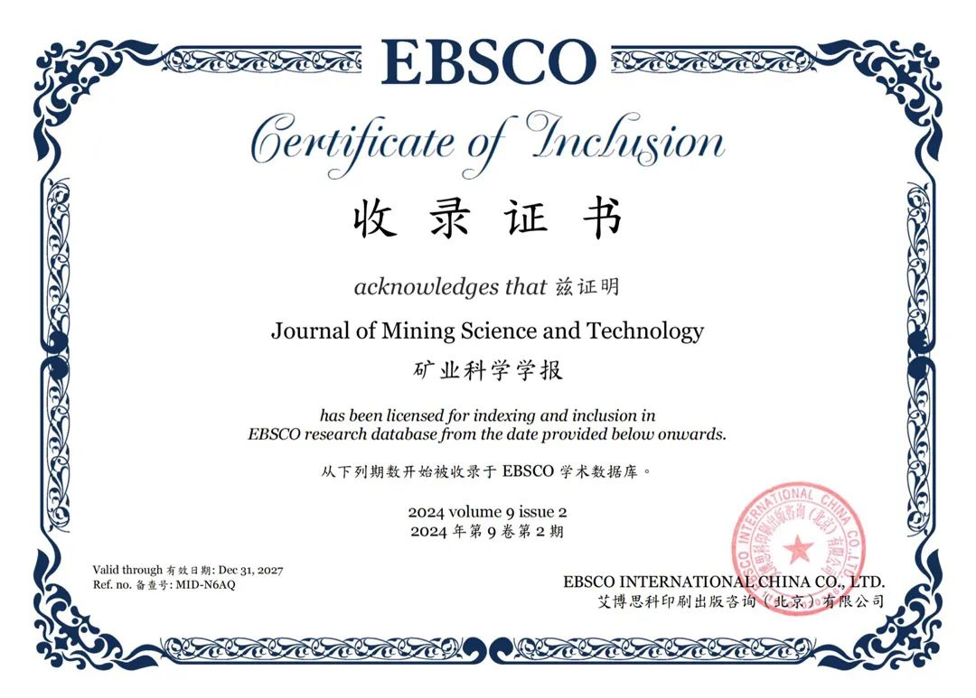 本网讯 近日,经过严格遴选和评审,《矿业科学学报》(Journal of Mining Science and Technology)正式被国际知名数据库EBSCO收录,收录起始时间为2024年第2期。