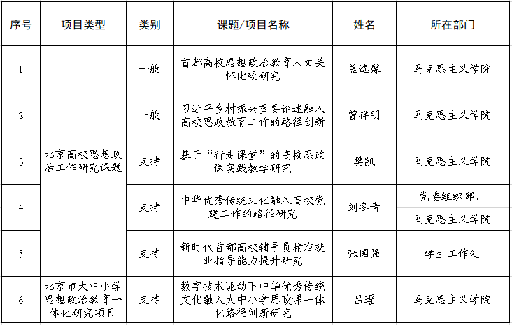 本网讯 日前,北京市委教育工作委员会公布了2023年度北京高校思想政治工作研究课题中标名单,和2023年度北京市大中小学思想政治教育一体化研究项目立项名单。我校共6项课题获批立项,其中一般课题2项,支持课题4项。