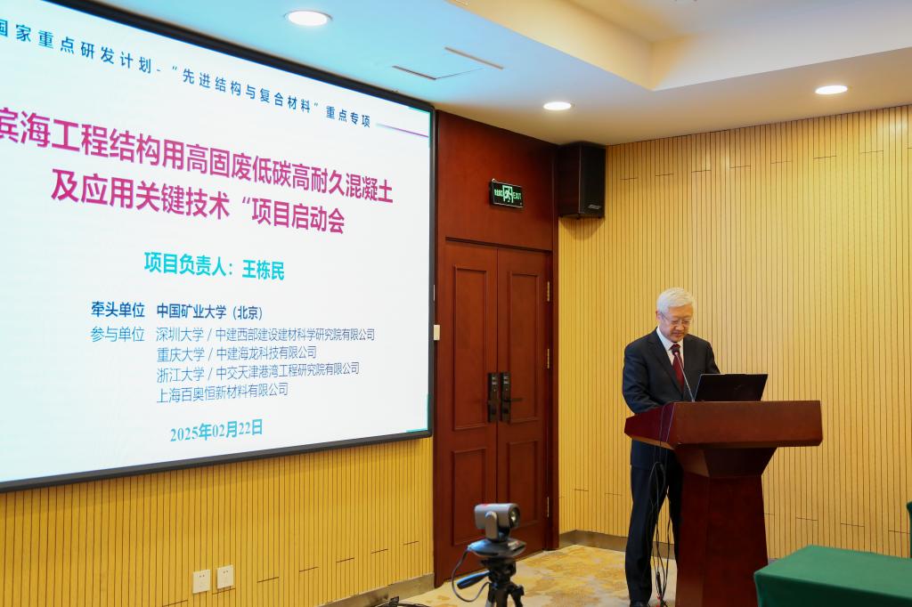 本网讯 2月22日上午,由中国矿业大学(北京)作为牵头承担单位,我校王栋民教授主持的“十四五”国家重点研发计划项目“滨海工程结构用高固废低碳高耐久混凝土及应用关键技术”(编号2024YFB3714800)启动会暨实施方案论证会在北京召开。项目责任专家华北理工大学校长张福成院士、苏州实验室祝伟丽教授级高工,评审专家东南大学缪昌文院士、中国建筑材料科学研究总院有限公司郅晓董事长、武汉理工大学副校长王发洲、中科院过程工程研究所循环经济技术中心主任李会泉教授、清华大学孔祥明教授,顾问专家重庆大学周绪红院士、杨永斌院士、中国矿业大学(北京)武强院士、深圳大学陈湘生院士出席会议。中国矿业大学(北京)校长刘波、副校长崔希民,科学技术研究院、化学与环境工程学院相关负责人,项目及各课题负责人、相关专家、研究骨干等40余人出席会议。张福成院士任评审专家组组长。崔希民主持会议。