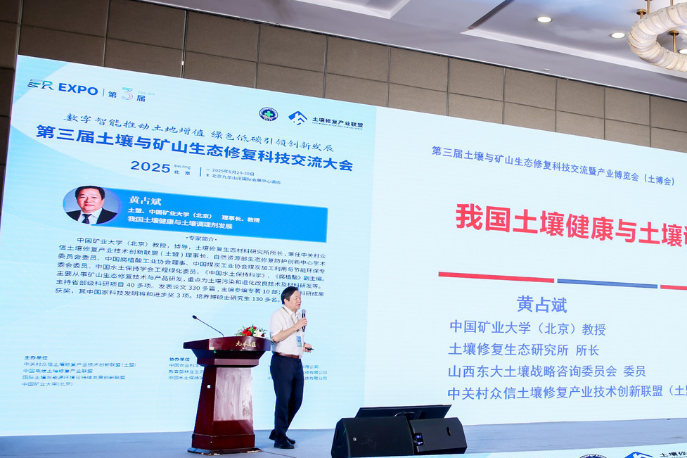 化环学院教授、中关村众信土壤修复产业技术创新联盟(土盟)理事长黄占斌教授在大会上致辞,指出土地整治、矿山修复与废物资源化利用近年来已经成为土壤与矿山生态修复的核心内容,目前行业正立足国家政策,聚焦技术革命,驱动产业升级,构建生态闭环,赋能长效发展。每年土博会的举办已成为行业新产品新技术发布、项目需求对接、产学研用合作等方面的重要平台。